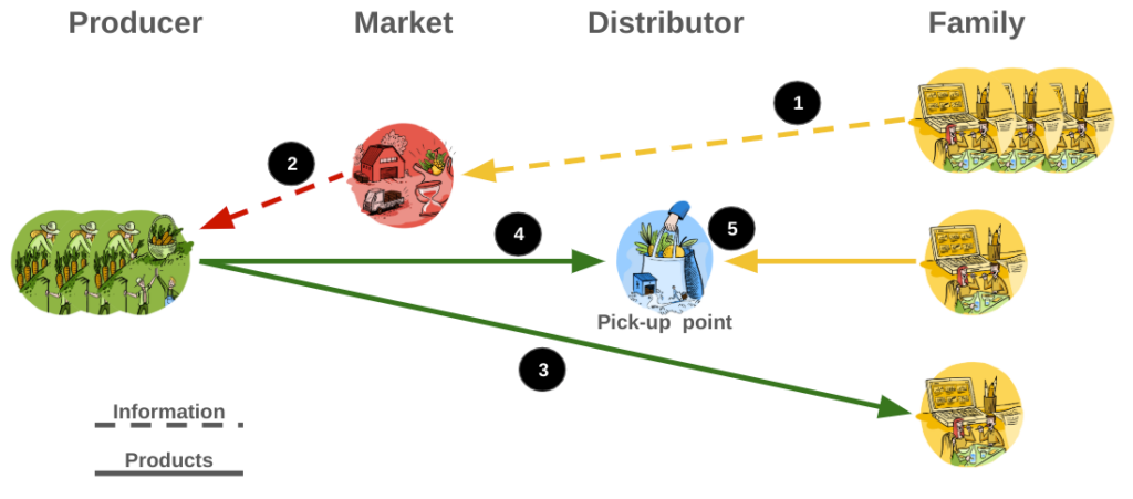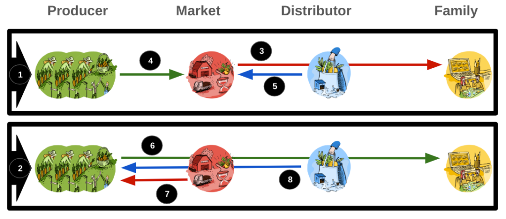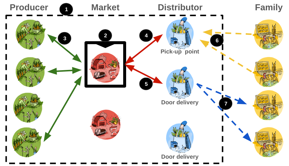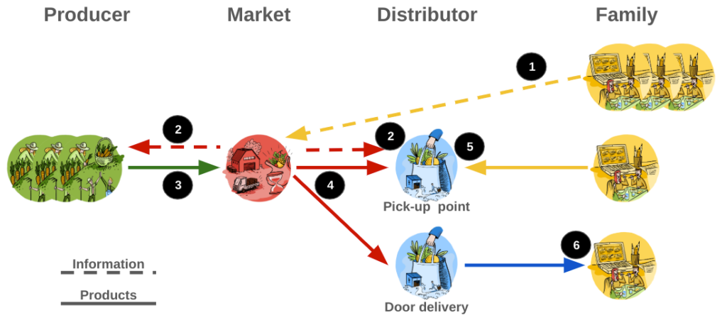 1. Der Markt kauft die Produkte von den Erzeugern und die Abhol- oder Lieferdienste von den Händlern und verkauft die Kombination aus beidem an die Familien;