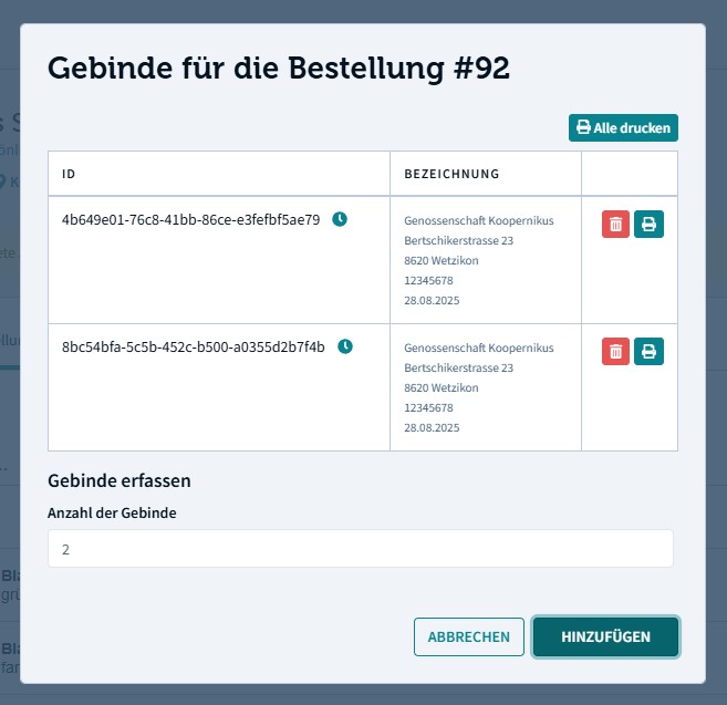 Jedes Gebinde, das erstellt wurde, hat eine eindeutige ID. Du kannst ein Versandetikett mit einem QR-Code drucken.