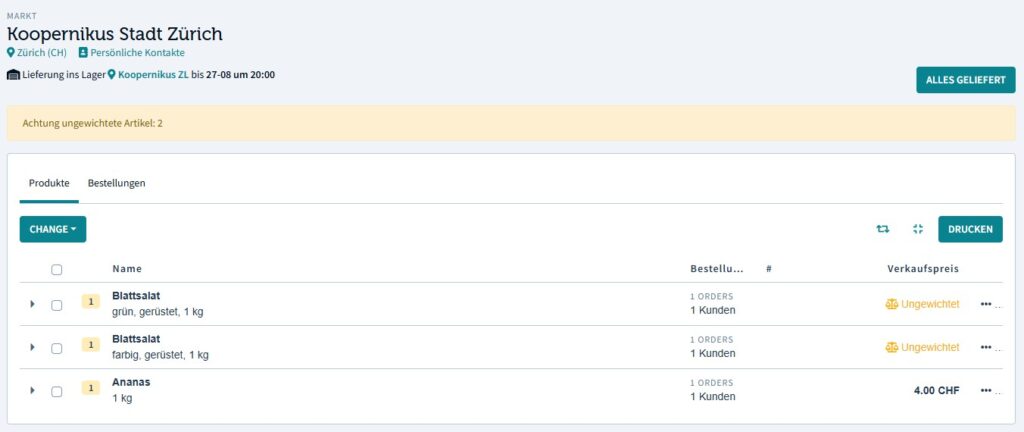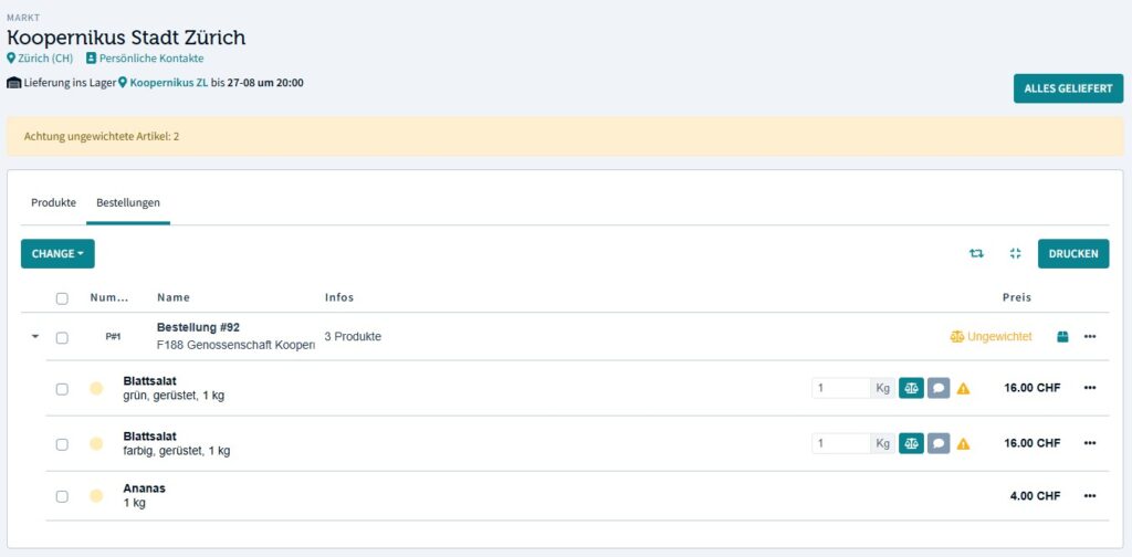 Aufgabe 2: Nachdem du die Waren verpackt hast, ändere bitte den Status der Bestellposition auf geliefert. Du kannst dies in einem Schritt für alle Bestellpositionen einer Bestellrunde tun, indem du auf die Schaltfläche "Alles geliefert" klickst.