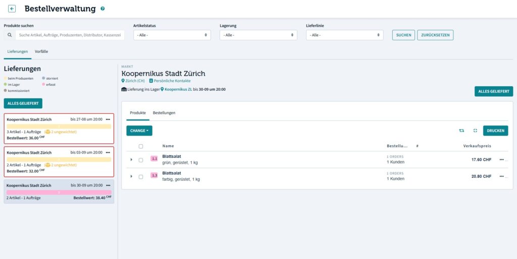 • Im Tab "Lieferungen" siehst du alle anstehenden Bestellrunden und die dazugehörigen Bestellungen, die von dir bearbeitet werden müssen.
