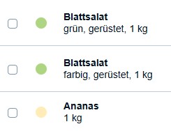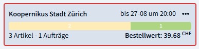 Die farbige Linie gibt die eine schnelle Möglichkeit, den Status einer Bestellrunde zu beurteilen. Sie wird proportional zu dem Status eingefärbt, in dem sich die Bestellpositionen befinden (siehe Status-Spickzettel um mehr über Statusfarben zu erfahren). Im obigen Beispiel befinden sich insgesamt 3 Produkte in der Bestellrunde, von denen 1 bereits bearbeitet wurde (grün) und zwei auf die Bearbeitung durch dich warten (gelb).
