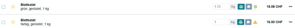 1. Gib das Gewicht direkt in jeder Zeile der Auftragsposition ein und bestätige es mit einem Klick auf das Waagensymbol. Ein grünes Häkchen zeigt an, dass das Gewicht korrekt eingegeben wurde, während ein gelbes Warndreieck anzeigt, dass das Gewicht noch eingegeben werden muss.